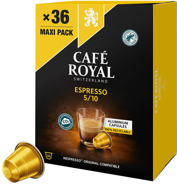 Új eszpresszót keresel? A svájci Café Royal márka nagy csomagot készített finom eszpresszójukból, így hosszabb ideig élvezheted az ízletes kávét, mielőtt újra raktározni kellene.  Ez a finom eszpresszó 100% Arabica babokból készül, amelyeket közepes erősségűre pörköltek. Finom savasságuk tökéletes egyensúlyban van a babok által biztosított fűszeres ízzel. Nem túl erős, így ezt az eszpresszót bármikor élvezhetjük: reggel ébredéskor, ebéd lezárásaként, egy délutáni kávészünetre vagy esti eszpresszóként barátokkal.  Ez a csomag 36 alumínium kapszulát tartalmaz, amelyek kompatibilisek a Nespresso® gépeddel. Elegendő lesz ahhoz, hogy hosszabb ideig kielégítsd a kávéigényeidet, vagy megoszd barátokkal, családdal vagy kollégákkal.  Ezeket a kapszulákat nem a Nestlé® gyártja, azokat a vállalat nem hagyja jóvá és nem ajánlja, illetve nem kapcsolódnak ahhoz.