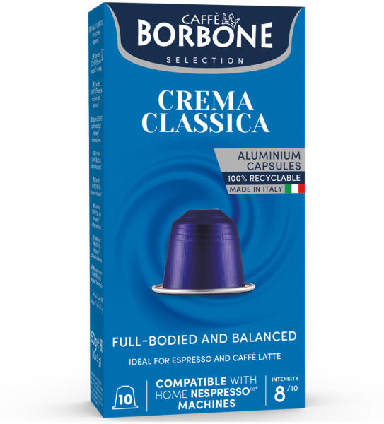 Caffé Borbone Crema Classica testes, kiegyensúlyozott és krémesen sima prémium nápolyi kávé, ami ideális tejalapú kávé italokhoz is. Prémium arabica és robuszta fajták finom választékából készült a testesség, a tartós íz és az édesség közötti tökéletes egyensúly érdekében. A Crema Classica kávét nemes ízvilág, erőteljes karakter és intenzív illat jellemzi. 8-as erősség. Alumínium kapszula Nespresso kávégépekhez.