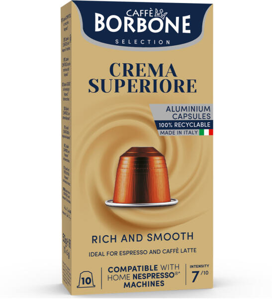 Caffé Borbone Crema Superiore aromás és krémesen sima prémium nápolyi kávé. Ideális tejalapú italokhoz is. Prémium arabica és robuszta fajták finom választékából készült. Az íz, a kifinomultság, a krémesség, az édesség és a karakteresség tökéletes keveréke. A Crema Superiore még a legigényesebb kávé ínyenceket is kielégíti, vagy azokat, akik szeretnének belekortyolni Nápoly igazi ízébe, annak teljes szépségében. Intenzivitás: 7-es. Alumínium kapszula Nespresso kávégépekhez.