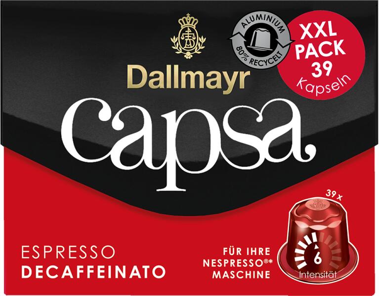 Dallmayr Capsa Espresso Decafeinizata XXL kávékapszula, 39db x 5.6gLegnépszerűbb alapkávéink – Prodomo, Espresso Decaffeinato, Lungo Azzurro, Espresso Barista és Lungo Belluno – egy praktikus mega dobozban. Diós és cédrusos aromákkal, enyhén koffeinmentes. 100% Arabica