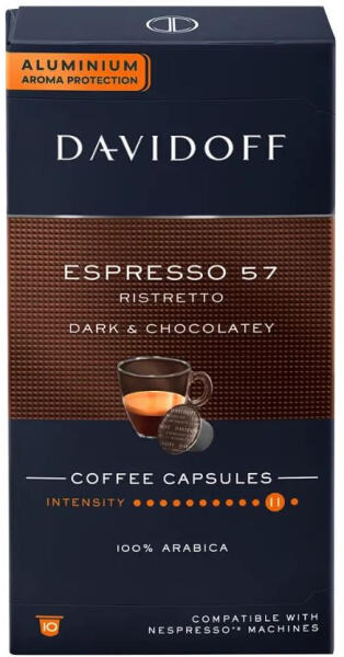 Élvezd a Davidoff Espresso 57 Ristretto intenzív, sötét pörkölésű ízvilágát! Ez a 100% Arabica kávé gazdag, csokoládés jegyekkel kényeztet, és tökéletesen kompatibilis a Nespresso® kávégépekkel.