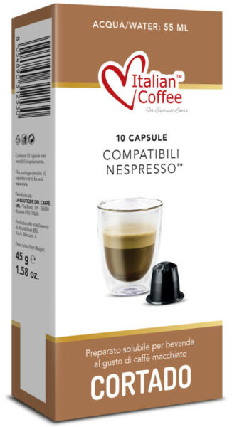 Élvezd a spanyol tejeskávé, a Cortado bársonyos ízét otthonodban! Az Italian Coffee kapszulái Nespresso kávégépekkel kompatibilisek, és egyetlen gombnyomásra tökéletes, habos italt készítenek.