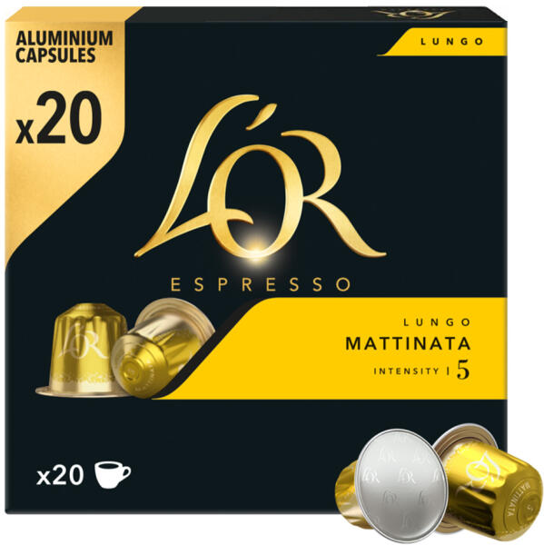 L'OR Mattinata egy finom kávé, tökéletes az első kávéhoz a nap folyamán. Minden alumínium kapszula egy sima kávét tartalmaz, közepes intenzitással. A tetején lévő könnyű krém tökéletes befejezést ad neki, és a kávé önmagában is finom, vagy egy csepp tej hozzáadásával. Ez a csomag 20 kapszulát tartalmaz, tökéletes, ha ez a kedvenc L'OR kávéja. Ezeket a kapszulákat nem a Nestlé® gyártja, azokat a vállalat nem hagyja jóvá és nem ajánlja, illetve nem kapcsolódnak ahhoz.