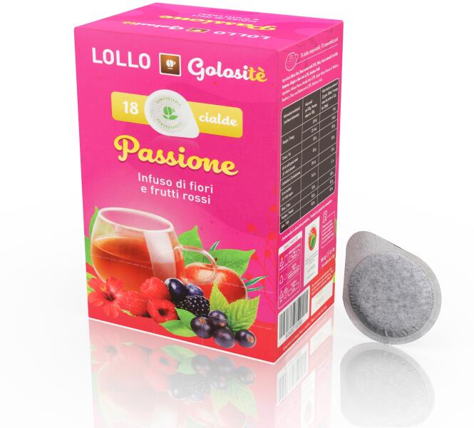 Tea Lollo Passione Red Fruit ESE hüvely Lollo Caffe 18 db Hibiszkusz virágok, kutyarózsa, alma és piros gyümölcsök, varázslatos karakterrel, az illatos virágok és gyümölcsök egyensúlyával. Hozzávalók: Hibiszkusz virágok. Csipkebogyó 35%. Alma, természetes áfonya aroma. Málna, cseresznye és feketeribizli 6,3%. Bodza gyümölcsök.