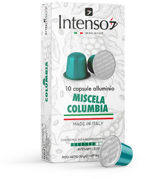 Intenso Colombia prémium minőségű olasz 100% Arabica Nespresso kompatibilis kávékapszula a kifinomult és gazdag aromák, valamint és sűrű, krémes textúrájú kávék kedvelőinek. A legjobb kolumbiai 100% arabica kávét klasszikus nápolyi lassú pörköléssel (közepes erősség) készítették az Intenso kávémesterei. Legfőbb ízjegye a mogyoró és a csokoládé kellemes gyümölcsös és virágos ízjegyekkel gazdagítva.