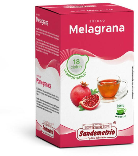 Sandemetrio gránátalma ízesítésű tea E. S. E. pod. Kellemes és gyümölcsös ízű, ideális a nap bármely szakában. Hozzáadott cukor nélkül. A doboz 18 db 44mm-es E. S. E. pododot, teapárnát tartalmaz. Összetevők: hibiszkusz virágok, csipkebogyó, alma, gránátalma héj 10%, természetes ízesítő, narancshéj, gránátalmalé granulátum 5% Nettó súly: 45 g